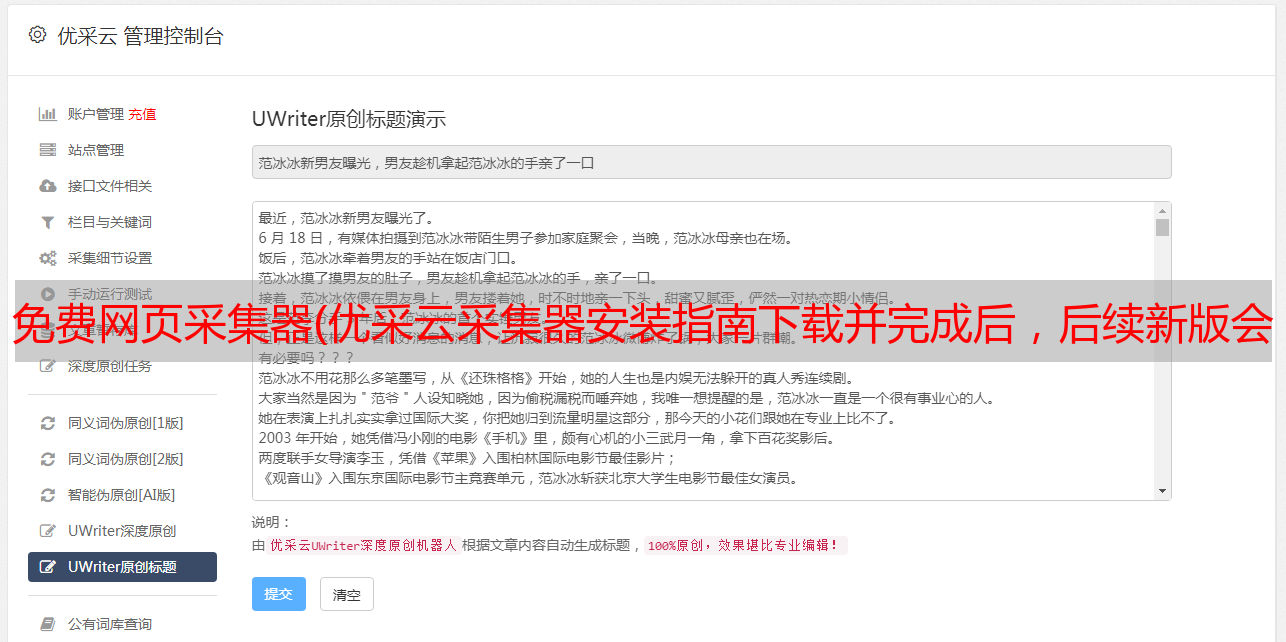 优采云采集器是一款非常实用的网页采集软件,它可以方便的帮助用户采集各种网页数据内容,包括文字、图片等不同类型的内容。优采云采集器 操作非常简单,采用可视化的采集方式,用户可以实时查看采集的信息,有需要的用户请下载。