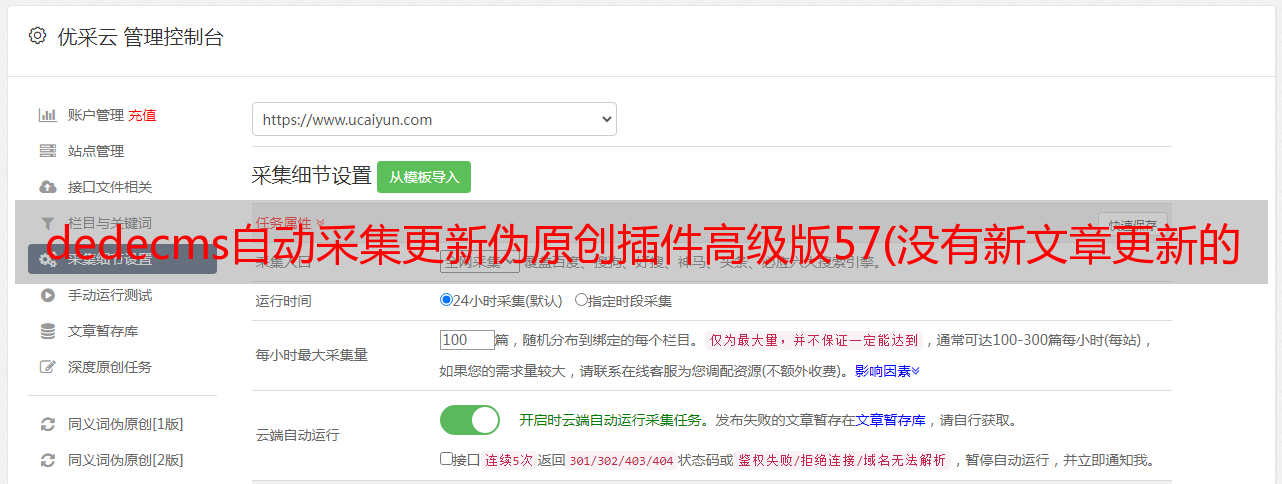 优采云 发布时间: 2022-01-06 04:00dedecms自动采集更新伪原创插件高级版57(没有新文章更新的栏目不会更新,栏目id插件介绍)