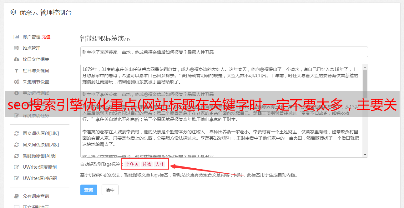 优采云 发布时间: 2022-01-06 04:08seo搜索引擎优化重点(网站标题在关键字时一定不要太多,主要关键字2-3个即可)