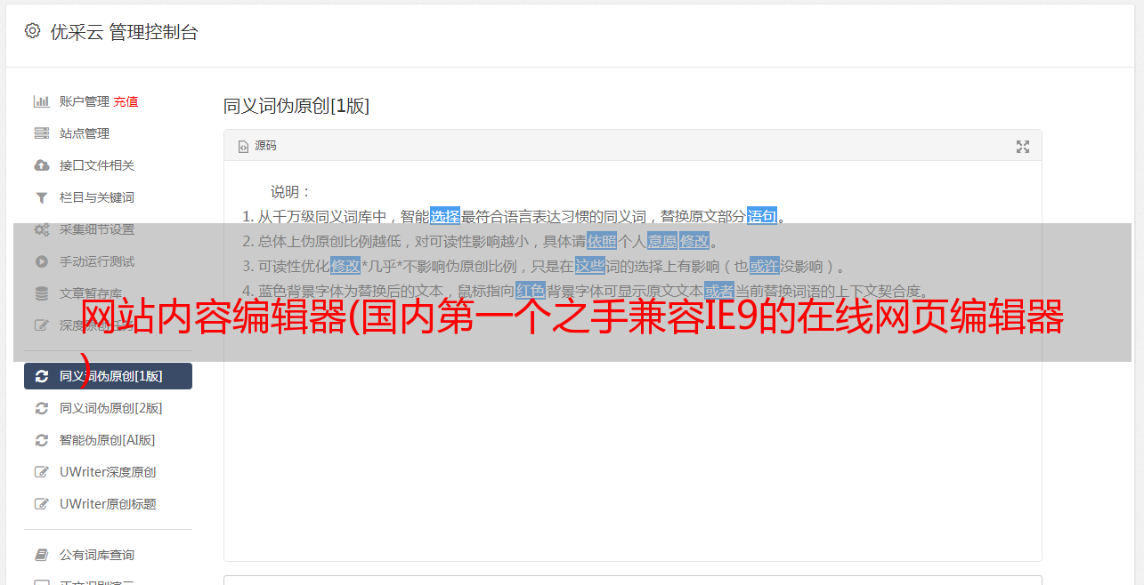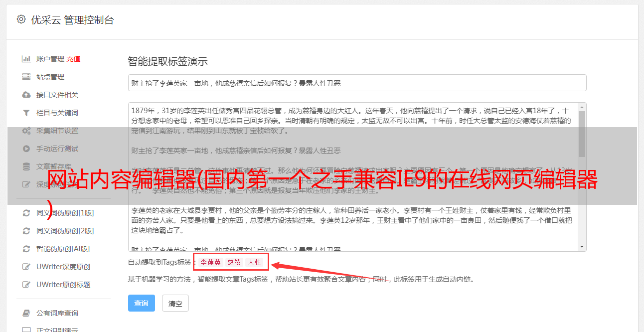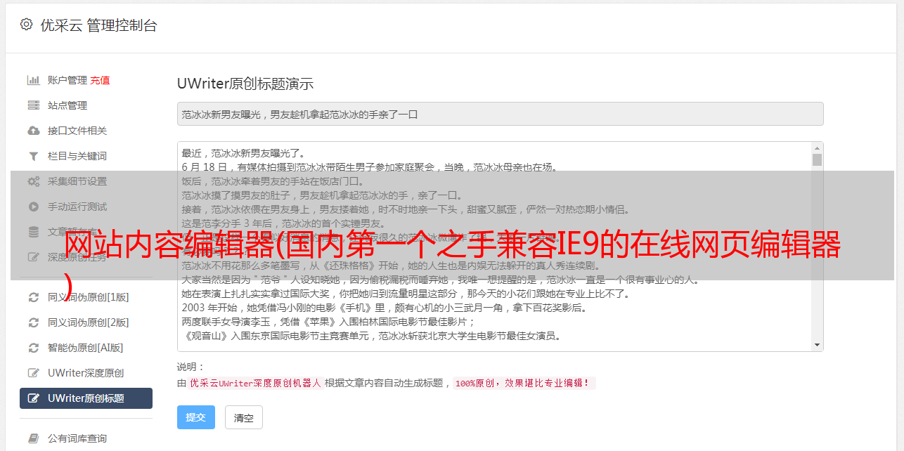 优采云 发布时间: 2022-01-07 09:06网站内容编辑器(国内第一个之手兼容IE9的在线网页编辑器