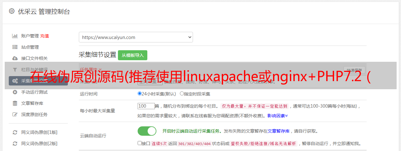 优采云 发布时间: 2022-01-07 16:09在线伪原创源码(推荐使用linuxapache或nginx+PHP7.2(使用宝塔即可一键安装环境))