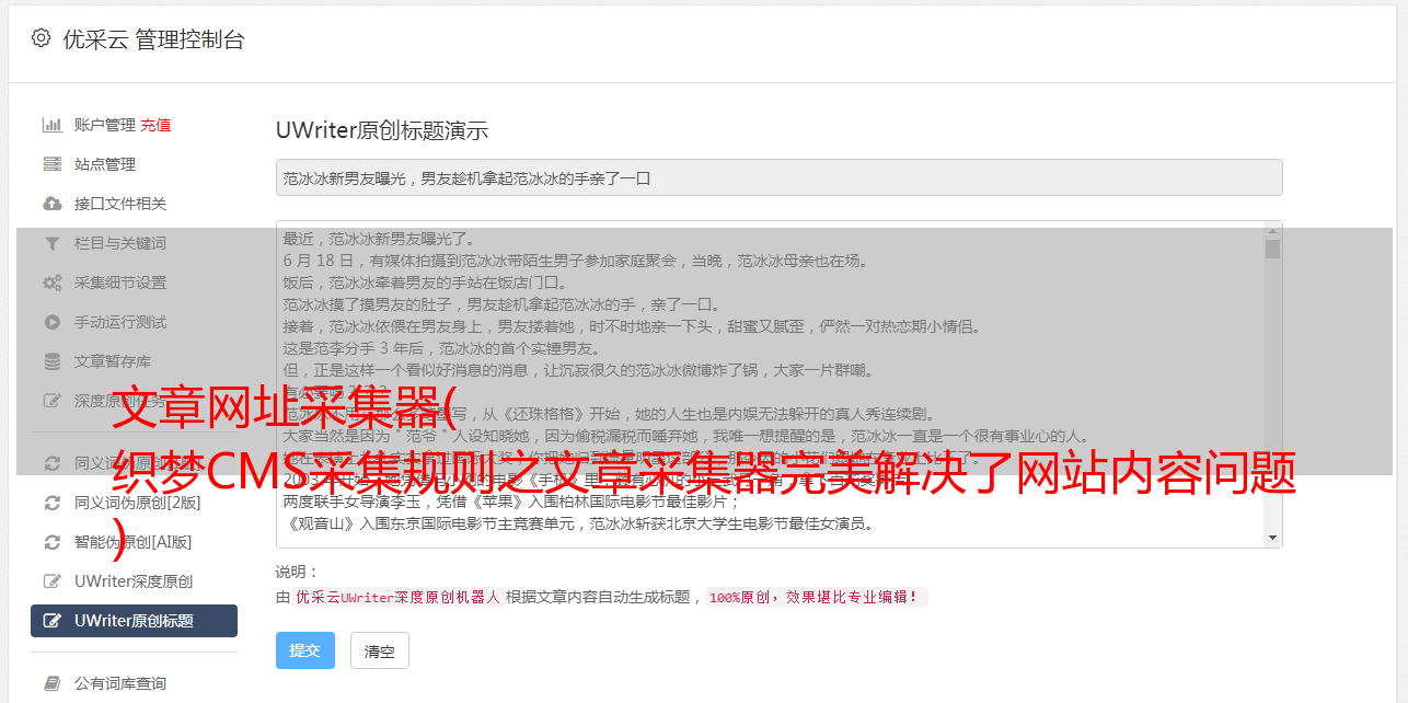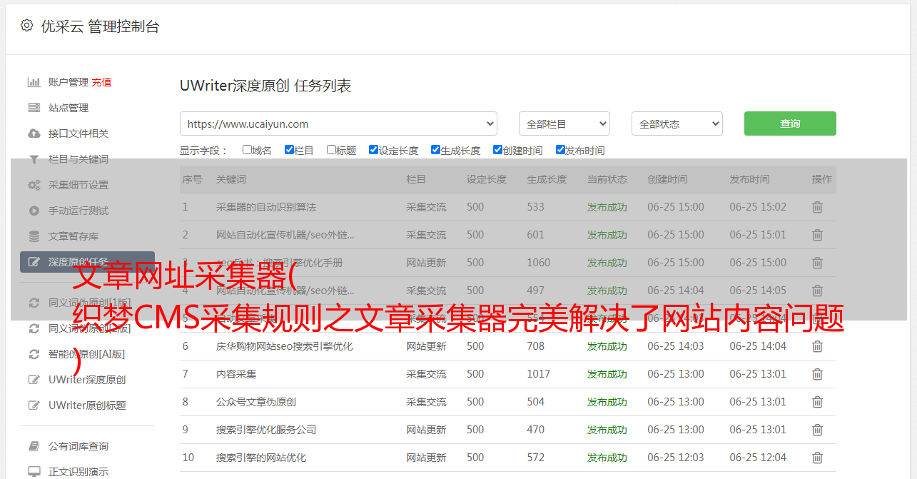 织梦cms采集文章采集器的规则,好处是即使不在线也可以保持网站的新内容每天发布,因为配置了自动发布,只要设置好,就可以定时定量更新。多种伪原创@>和优化方法,提升伪原创0@>的命中率和排名。自动标题、段落重排、高级混淆、自动内链、内容过滤、URL过滤、同义词替换、seo词插入、关键词 @>添加链接等方法处理伪原创1返回的文章 @>,提升采集文章原创性能,有利于搜索引擎优化,提升搜索引擎伪原创0@>、网站权重和关键词 @> 排名。