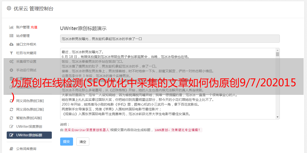 优采云 发布时间: 2022-01-08 18:09伪原创在线检测(SEO优化中采集的文章如何伪原创9/7/202015