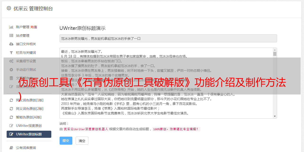 优采云 发布时间: 2022-01-09 12:16伪原创工具(《石青伪原创工具破解版》功能介绍及*敏*感*词*法