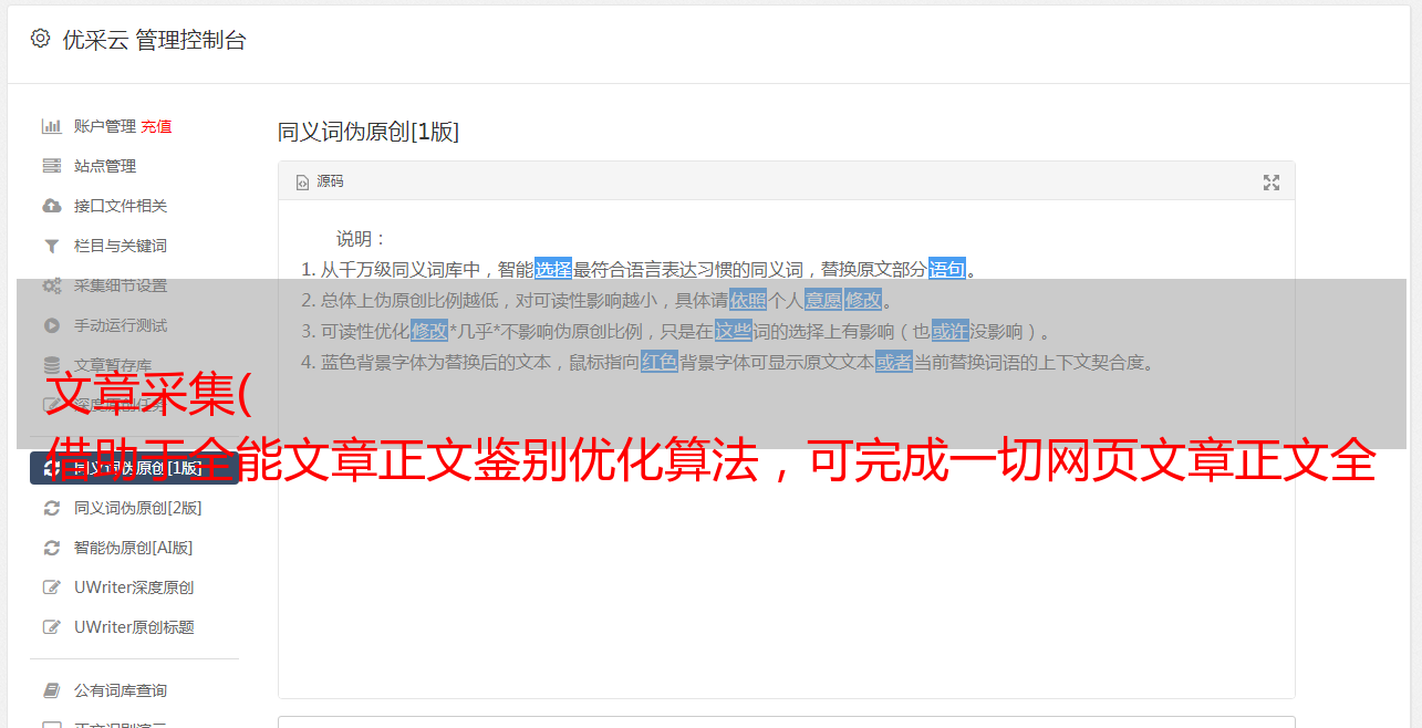 文章采集器是一个简单、有效、强大的文章采集功能,帮助网站完成文章内容的自动更新。只需要会输入关键字,就可以采集各种百度搜索引擎网页和新闻报道,还可以采集具体网址文章,很是时间——省力省力; 一、 借助全方位的文章文本识别与优化算法,自动获取所有网页文章文本,准确率达95%以上。只需输入关键字,即可采集到各大新闻和网页,多数据源新闻和网页;海量关键词可以自动化采集。 采集具体URL频道目录文章下所有项目均可设置,智能系统配对,无需编写复杂标准。 文章翻译功能,可以很好的用于采集文章,把它的中文翻译成英文再翻译成中文,实现翻译原创文章,适合用于谷歌和有道翻译。非常简单和智能文章采集器*敏*感*词*使用。