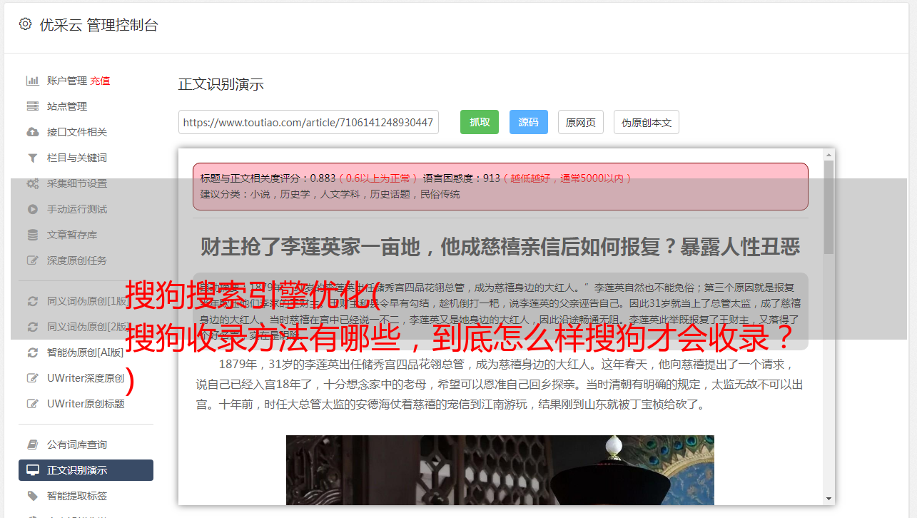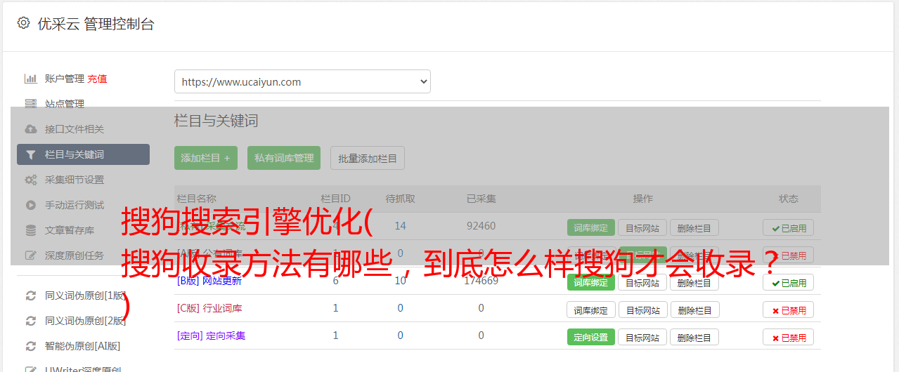 搜狗收录方法,第一点:坚持每天更新网站的内容,根据条件和时间更新1-2篇原创文章。这种情况适用于站点较少的站长,大多数站长的站点都比较多,所以更多时候会使用采集工具来完成网站内容填充,所以我们使用整个平台采集@ > -伪原创-发布工具,一键完成更新内容的任务网站。