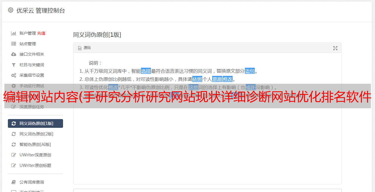 编辑网站内容(手研究分析研究网站现状详细诊断网站优化排名软件及优化工具服务内容 )
