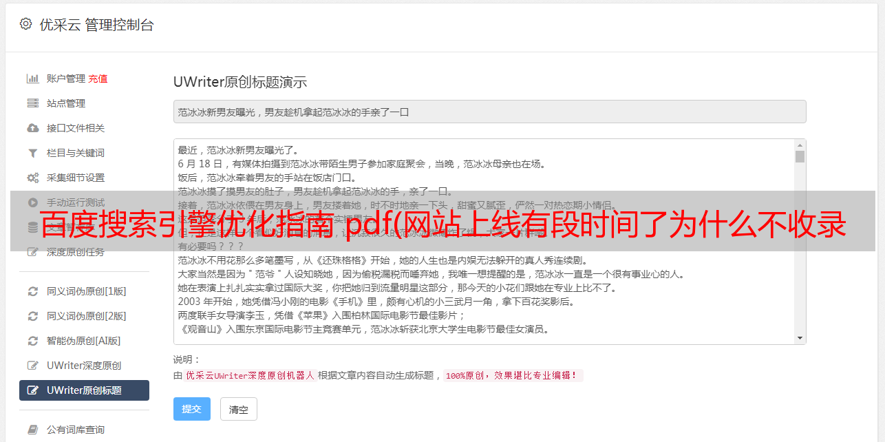 优采云 发布时间: 2022-01-11 20:19百度搜索引擎优化指南 pdf(网站上线有段时间了为什么不收录?结合百度整理出收录秘籍)