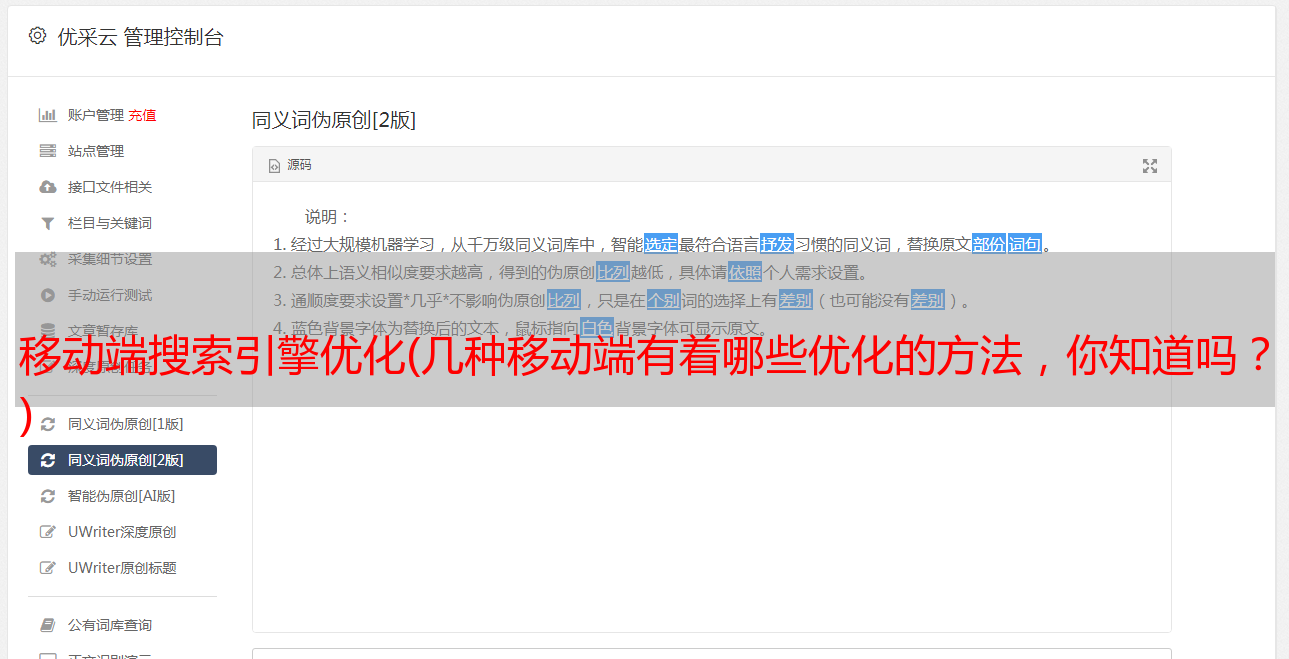 优采云 发布时间: 2022-01-12 04:18移动端搜索引擎优化(几种移动端有着哪些优化的方法,你知道吗?