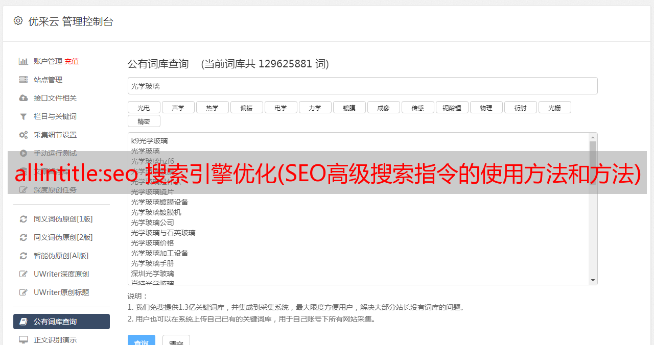 优采云 发布时间: 2022-01-13 01:19allintitle:seo 搜索引擎优化(SEO高级搜索指令的使用方法和方法)