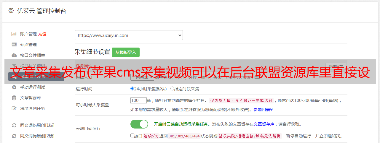 苹果cms采集视频可以直接在后台联盟资源库采集中设置,也可以配置自己自定义的采集库,以及关于文章的信息采集,苹果的cms后台没有配备专门的采集库,所以文章采集需要我们自己添加采集接口,还是用第一个三方采集工具给看不懂代码的小白不知道怎么弄了。前期,目前80%的影视站都是靠采集来扩充自己的视频库,比如之前的大站电影天堂、BT站等最新电影的下载。这一切都始于 采集。先丰富视频源再做网站收录 网站收录 由 文章 信息驱动。今天我们将介绍使用免费的自动 采集 发布工具来让 Apple cms网站 运行起来!