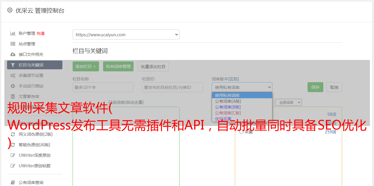 WordPress发布工具,无需插件和API,实现WPcms发布文章,自动批量SEO优化。WordPress发布可以实现网站自动采集和发布,即以量取胜的方式获得百度收录和关键词排名,从而获得被动搜索引擎交通。WordPress发布还配备了采集功能和自动伪原创,可以采集几乎所有类型的网页,无缝适配各类cms建站者,发布数据实时无需登录,实现定时定量自动采集发布,无需人工干预!就是站长网站管理,网站优化,大数据,云时代网站 数据自动化采集发布的SEO优化必备工具。更准确地说,WorePress 发布不仅仅是一个发布工具,它可以实现多个网站multiplecms同时同步管理,通过一个工具管理所有网站。各种网站cms都是我自己做的。利用工具的便利,我做的网站无论是收录还是排名效果都相当不错。
