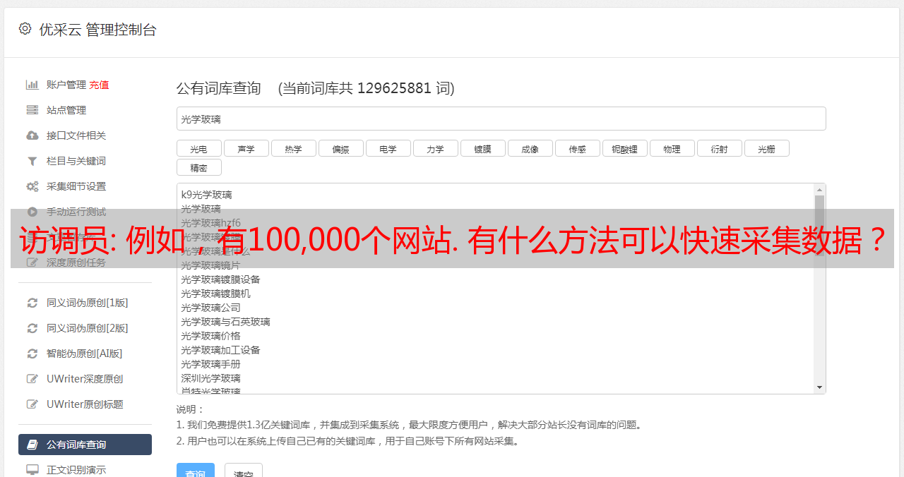 100,000个网站的采集范围已经比大多数专业的舆论监测公司广泛. 为了满足访问者提到的采集要求,我们需要综合考虑从网站采集到数据存储的各个方面,并提出适当的计划,以达到节省成本和提高工作效率的目的.