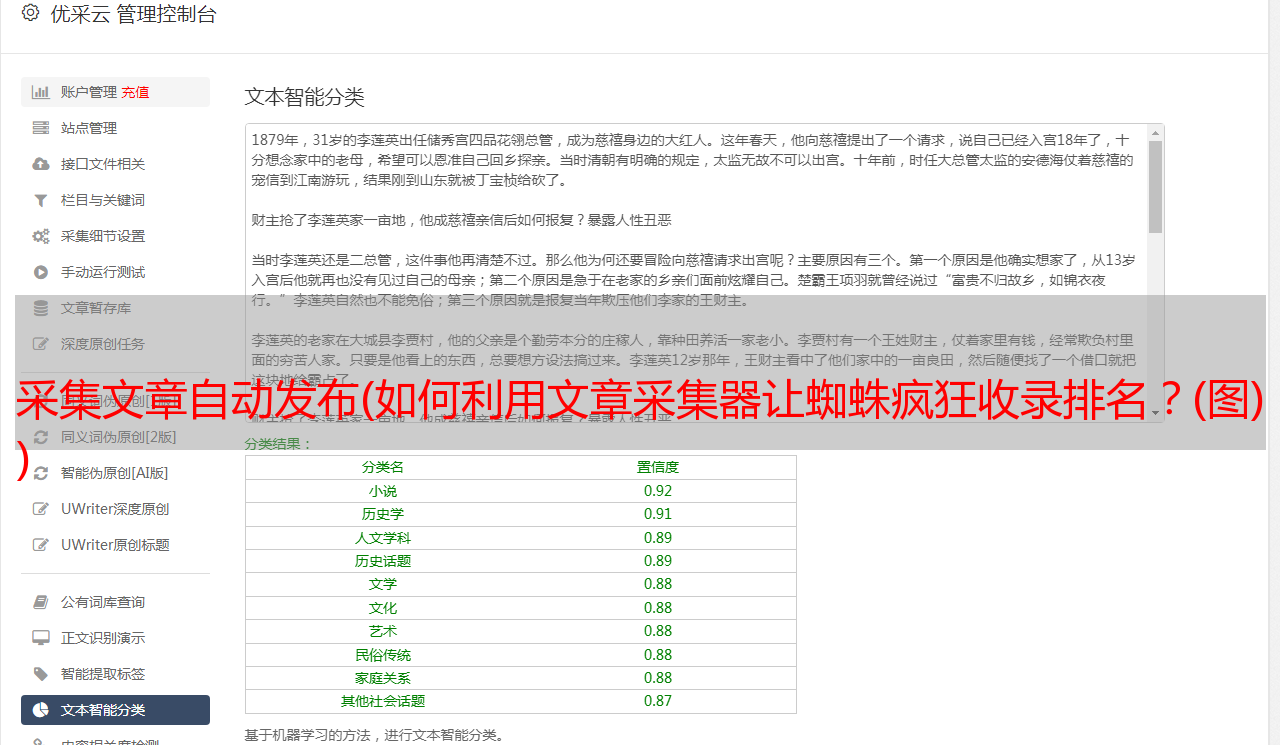 优采云 发布时间: 2022-01-15 14:05采集文章自动发布(如何利用文章采集器让蜘蛛疯狂收录排名?(图)