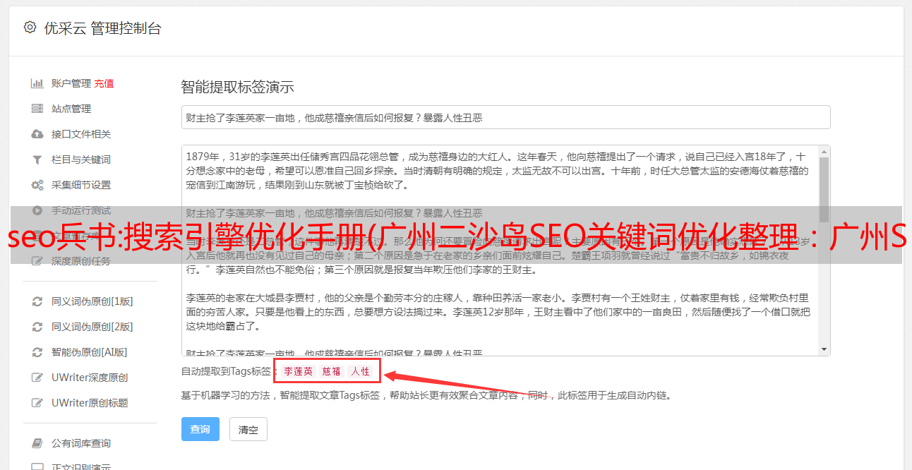 优采云 发布时间: 2022-01-15 16:08seo兵书:搜索引擎优化手册(广州二沙岛SEO关键词优化整理:广州SEO浏览量:192