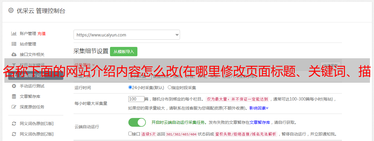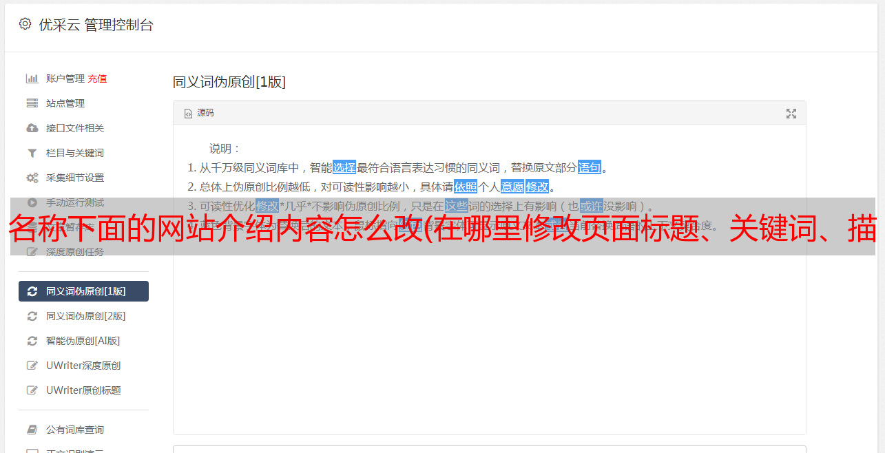 优采云 发布时间: 2022-01-17 21:02名称下面的网站介绍内容怎么改(在哪里修改页面标题、关键词、描述?(图))