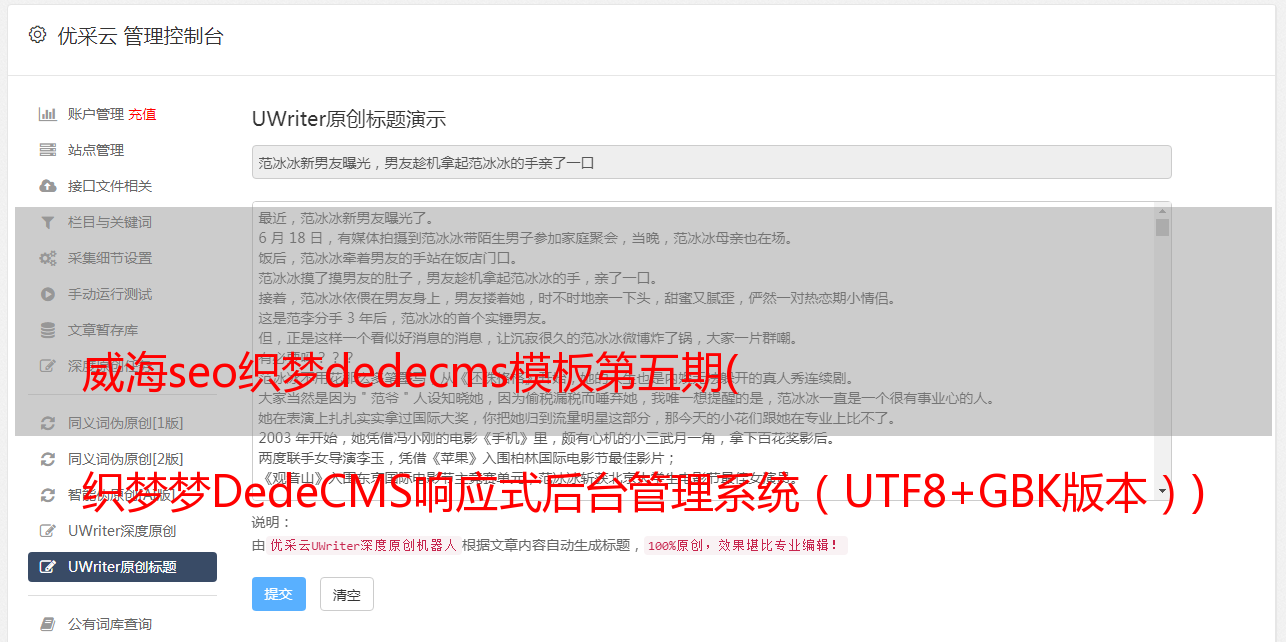 威海seo织梦dedecms模板第五期( 织梦梦DedeCMS响应式后台管理系统(UTF8+GBK版本))