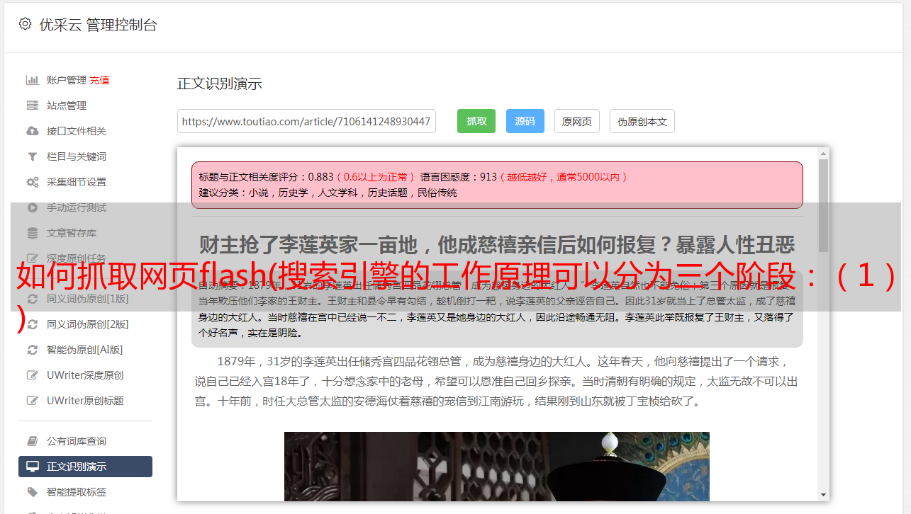 我们知道蜘蛛抓取的是收录所有HTML代码的页面,其中其实收录了很多信息:有文字、CSS属性、很多HTML格式标签、javascript程序!但是,后两者不能参与排名内容,也就是说,除了文字之外的所有内容都被删除。这个过程就是去除过程,也叫文本抽取过程,即:抽取出来的东西可以用于排序。已处理网站页面文本内容!