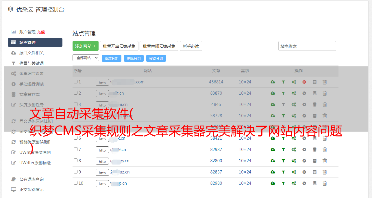 织梦cms采集软件文章采集器,基于织梦DEDEcms网站 采集和站群采集,可以根据关键词、RSS和页面监控等定期量化,可以在伪原创SEO之后更新发布优化,不用写采集规则! 织梦cms采集文章规则采集器不知道大家有没有看懂,可能有些站长还没联系! 采集工具一般用于网站内容填充或一些站群或大型门户网站,也有企业网站使用。当然有些个人网站也用采集可以,因为有些情况你不想自己更新文章,或者需要的文章网站太多更新了,比如新闻网站,都用采集。