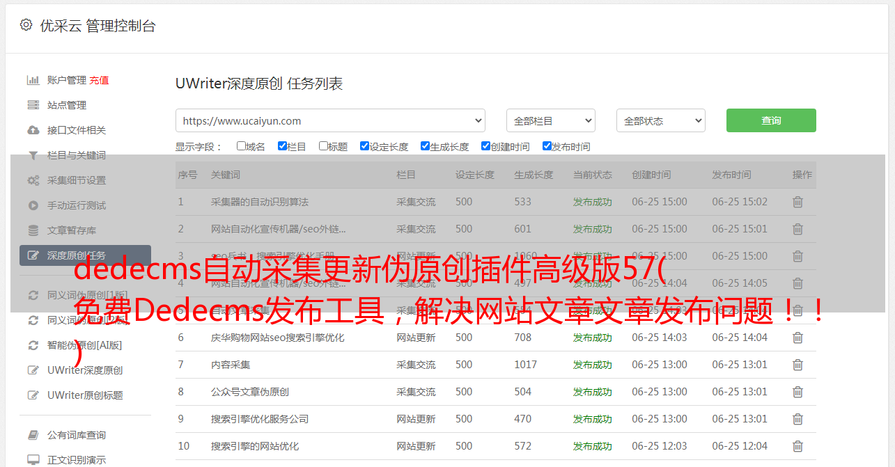免费Dedecms发布,同时进行SEO优化,绝不仅仅是发布文章那么简单。在发布设置模块中,可以在发布的时候自动伪原创,然后在伪原创之后发布,让搜索引擎认为大部分站点文章是原创文章,增加搜索引擎友好度,增加收录和关键词字数。还可以设置发布标题后缀文章,添加网站的相关关键词,提高关键词的排名和数量。插入内容关键词,增加网站关键词的出现频率,提高关键词的排名,肯定不是堆叠,因为配置了出现频率,100到1000字,你可以根据网站的情况进行选择,关键词还配备了内部链接,增加蜘蛛爬行路径。随机插入图片,让搜索用户输入网站后看到的内容更加直观美观。并且还可以设置随机点赞评论、随机阅读、随机作者等,让网站更加生动。最后还配置了发布后自动推送到百度/搜狗/神马,让新发布的文章能更快被搜索引擎发现,增加收录的时效性和被搜索率收录 。让搜索用户在输入网站后看到的内容更加直观美观。并且还可以设置随机点赞评论、随机阅读、随机作者等,让网站更加生动。最后还配置了发布后自动推送到百度/搜狗/神马,让新发布的文章能更快被搜索引擎发现,增加收录的时效性和被搜索率收录 。让搜索用户在输入网站后看到的内容更加直观美观。并且还可以设置随机点赞评论、随机阅读、随机作者等,让网站更加生动。最后还配置了发布后自动推送到百度/搜狗/神马,让新发布的文章能更快被搜索引擎发现,增加收录的时效性和被搜索率收录 。