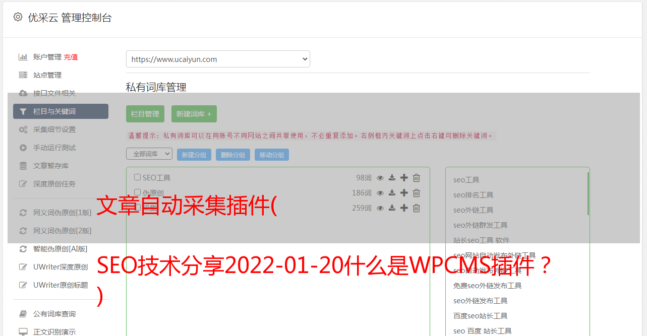 1、通过WPcms、关键词从下拉词、相关搜索词、长尾词中生成行业相关词。可以设置自动删除不相关的词。通过WPcms插件实现采集行业相关文章自动化,一次可创建几十个或上百个采集任务,同时支持多个域名任务时间采集@ >。