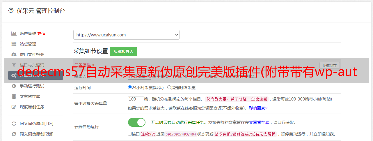优采云 发布时间: 2022-01-20 21:08dedecms57自动采集更新伪原创完美版插件(附带带有wp-autopost,采集规则编写教程,现成的教程)