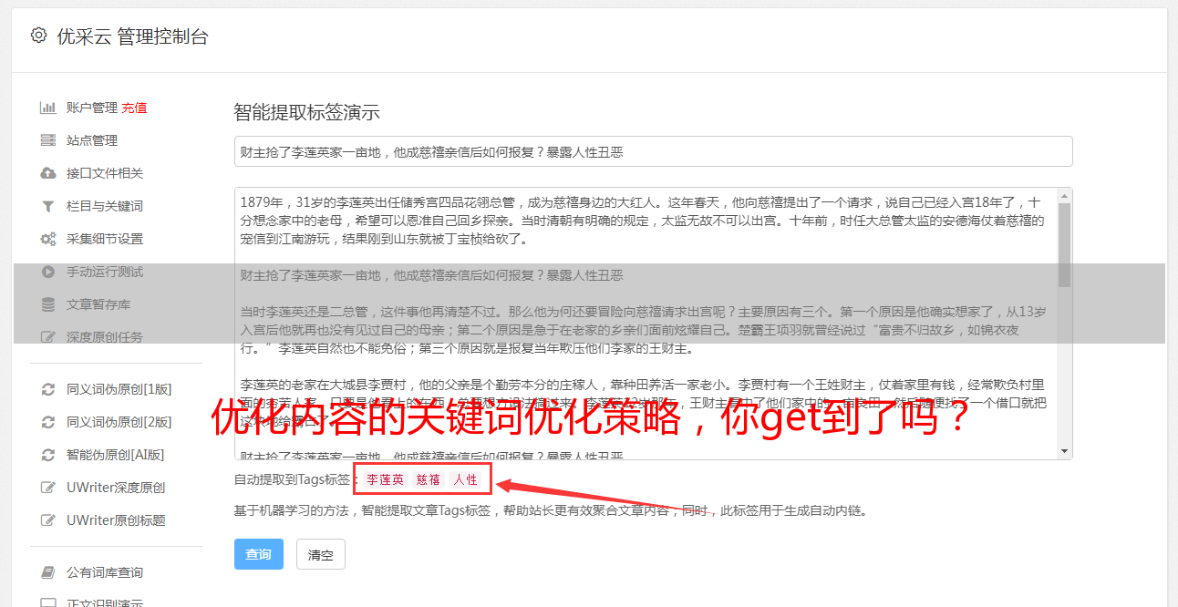 那么,此处的所谓值表示如果您希望这些内容在搜索引擎上排名,则必须使内容本身具有相应的关键词,这意味着您必须给他一个明确的目标,即关键词 ]在设置中有一些技巧,但这并不困难。例如,如果我们花了半个小时写一篇文章文章,但是这篇文章文章的标题可能非常俗气,并且没有用户搜索,并且用户搜索行为的用词不匹配,那么当用户搜索这个词时,我们肯定不会找到我们的内容,而这个内容正是我们的时光原创,它的价值非常高,也就是说,它的SEO值也非常高。如果我们不这样做,我们显然会失去它。效果好了吗?
