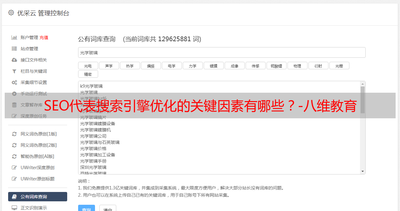 优采云 发布时间: 2021-04-27 07:28SEO代表搜索引擎优化的关键因素有哪些?-八维教育