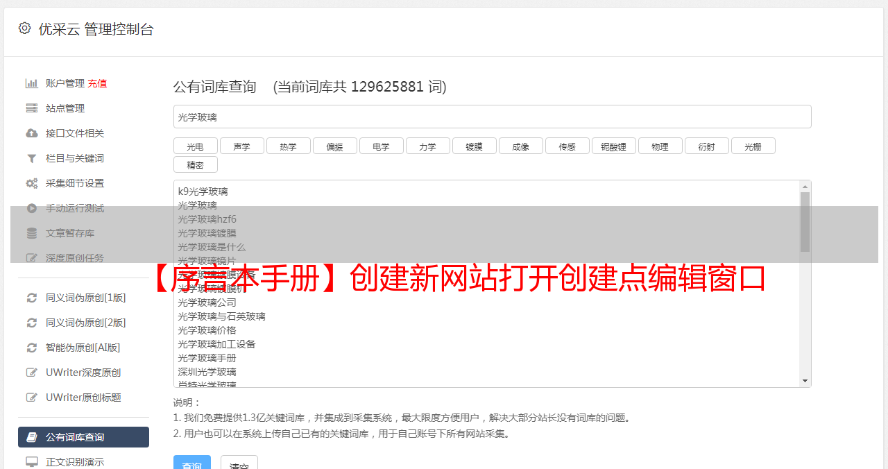 前言根据用户需求,本手册适用于 站群管理系统V30版本。每个模块的功能略有不同。提供的界面图片仅供参考。第1部分常规操作-系统登录并从前台单击管理网站登录到后端登录页面,或直接在前端登录窗口中输入帐户和密码,然后单击登录以输入系统后端登录界面。以下图片仅供参考。 Web方法登录窗口2.系统界面3.从主系统操作界面的右上方修改密码和个人信息在导航区域中,单击“修改密码和个人信息”以打开“修改密码”窗口和“修改个人信息”窗口。该密码必须提供正确的原创密码才能修改登录密码界面。5.注销从主系统操作界面右上角的导航区域中,单击注销以注销用户登录信息,然后返回到第二部分。登录界面网站管理站点管理站点管理的关键包括站点创建,修改,删除,审核和站点列管理。主站点管理界面如下图所示。 1从站点管理模块创建一个新站点,然后单击“新建” 网站以打开创建“新站点编辑”窗口。下图显示该站点收录两种类型:主站和类网站。在创建班级网站之前,必须预先在系统管理班级设置模块中设置学校班级。要创建新站点,您需要指定网站名称和URL 网站。选择此网站管理员指定的内容和窗口中每个项目的描述。该站点是系统门户。在整个系统中,只有系统管理员可以指定,并且只能指定一个。 网站是门户,被指定为门户。网站能够接收其他网站贡献。管理员可以管理此站点下的所有列内容,也可以管理站点列目标。 2修改站点信息,请参见创建新站点的效果。 3宣布并取消发布。只有已发布的站点可以接收提交并管理管理。成员可以根据自己的需要打开和关闭网站。 4删除站点。删除网站。该站点下面的所有列和所有内容将被同时删除,并且无法还原。请谨慎使用此功能。对于已经有内容的网站