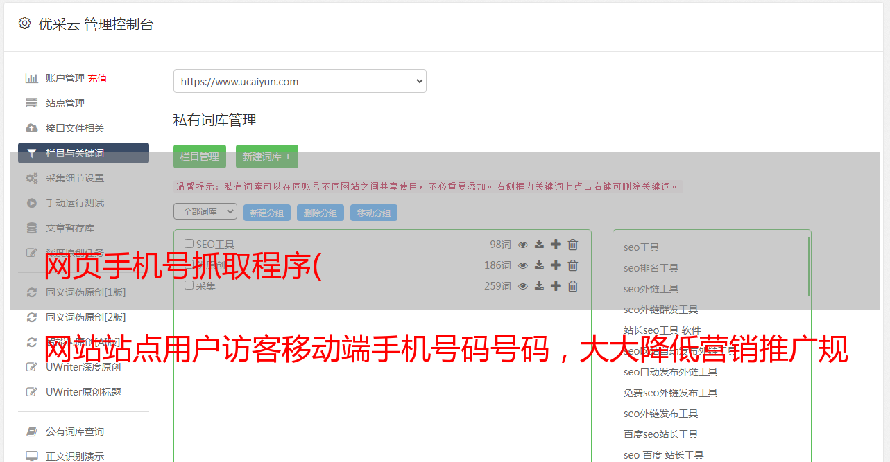 网站本站用户访客手机号抓取软件是一套专门用于手机站用户访客手机号抓取的专业软件。要使用它,您只需要在手机站安装一个简单的代码,当用户和访问者在手机上查看和浏览您的网页时,他们就可以抓取它。抓取移动端的手机号,登录到软件的在线后台后,可以清晰的看到用户和访客的信息,包括移动端。手机号码、网站标题TITLE、来源关键词关键字、来源url、地区、ip等,可通过Excel批量导出,方便管理。