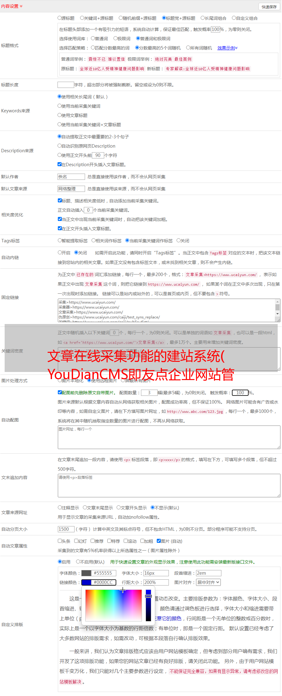 文章在线采集功能的建站系统( YouDianCMS即友点企业网站管理系统集PC站+微网站+多端小程序)