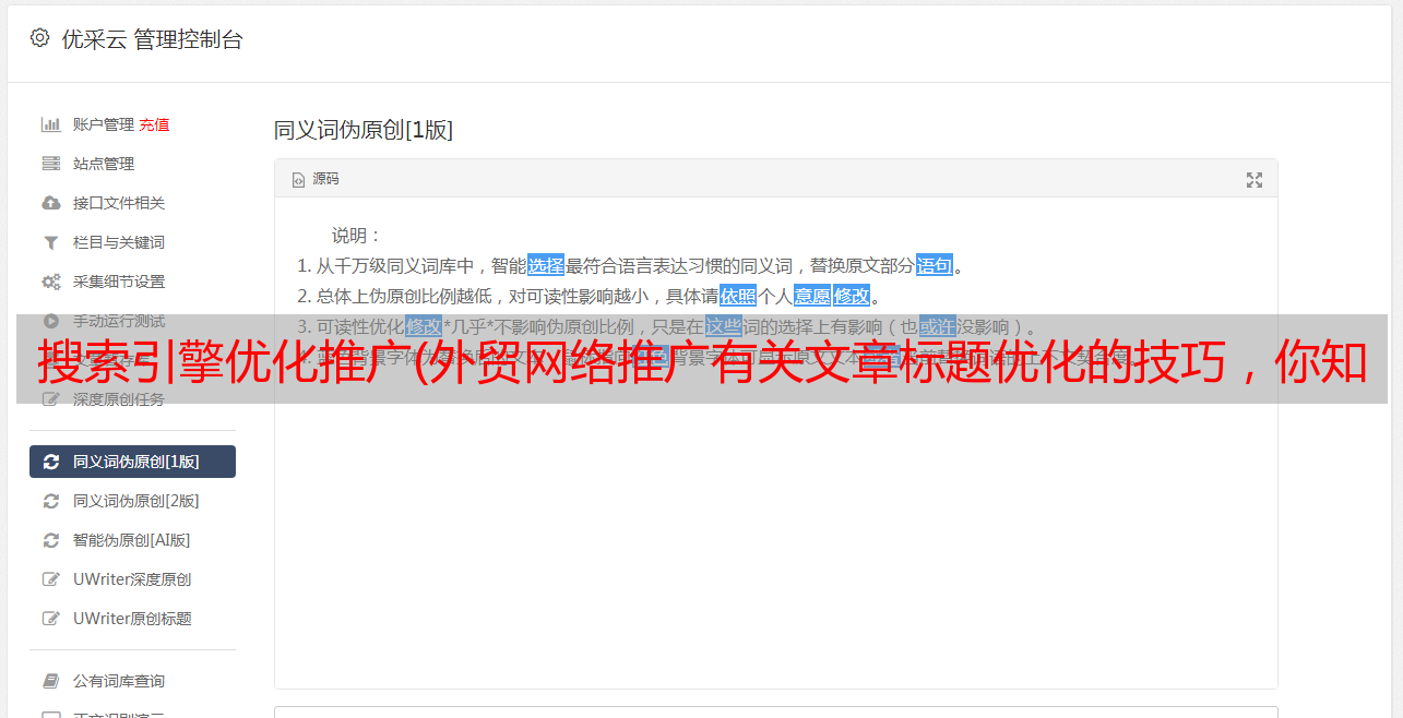 优采云 发布时间: 2022-01-28 04:09搜索引擎优化推广(外贸网络推广有关文章标题优化的技巧,你知道吗?)