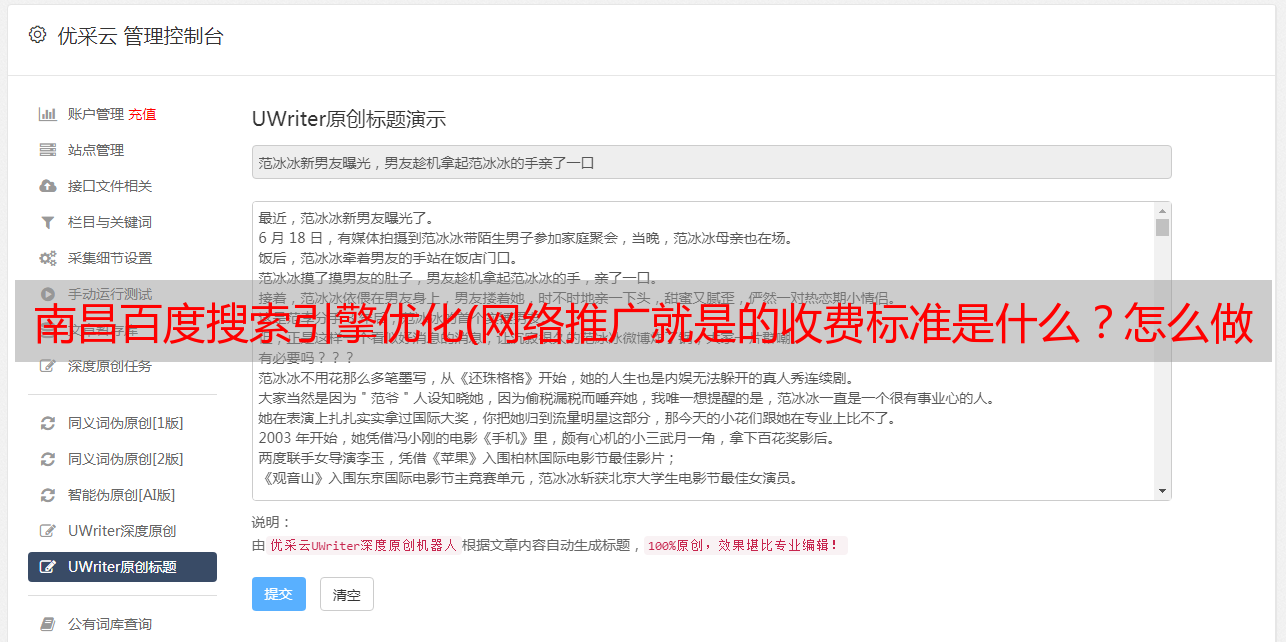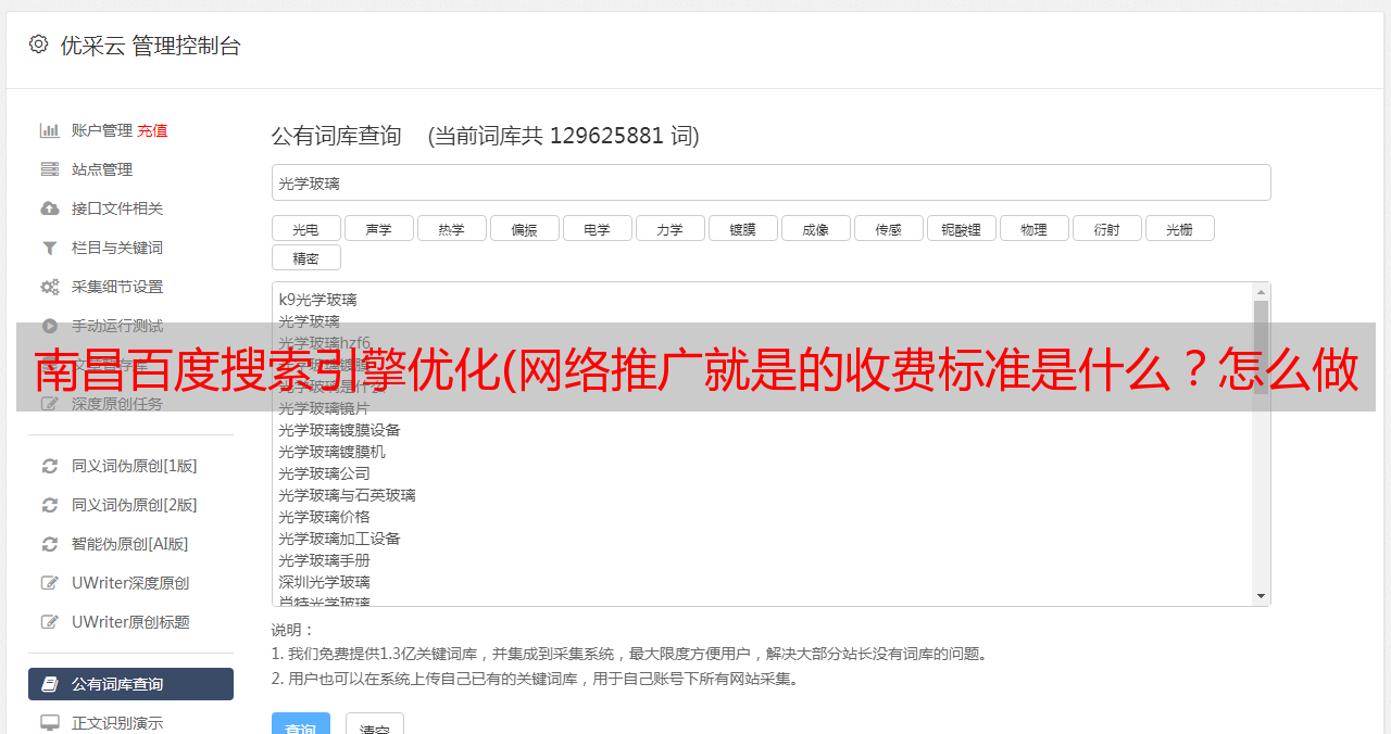 优采云 发布时间: 2022-01-28 13:11南昌百度搜索引擎优化(网络推广就是的收费标准是什么?怎么做??)