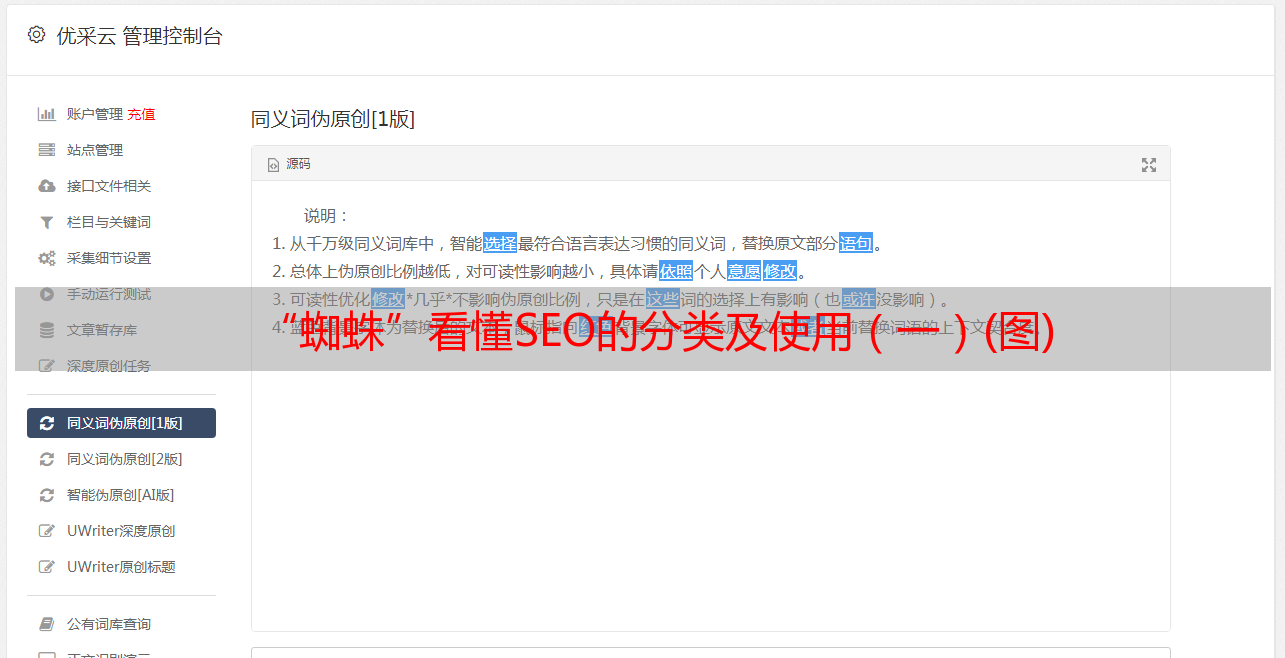 优采云 发布时间: 2021-04-29 00:27“蜘蛛”看懂SEO的分类及使用(一)(图)