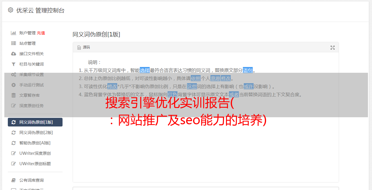 优采云 发布时间: 2022-01-30 14:10搜索引擎优化实训报告(