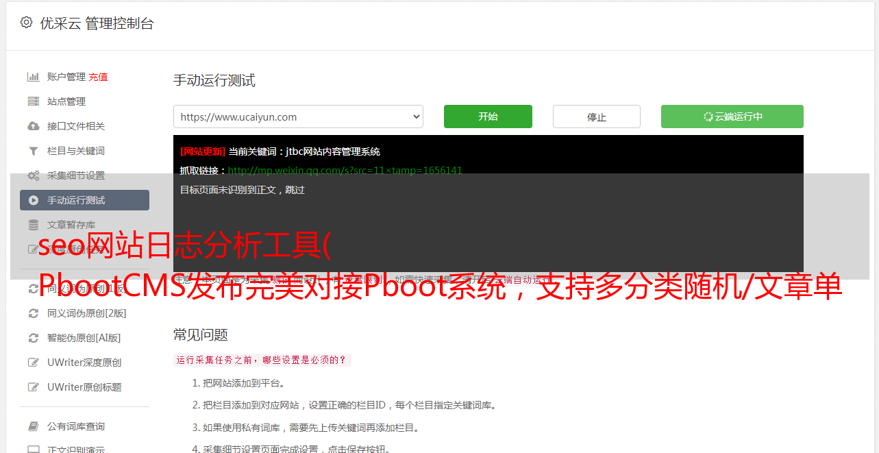 一个成功的网站背后,一定有一个默默付出的人。相信大家都很期待站内的文章能够收录越多越好,越快越好。然而,理想很幸福,现实很骨感!文章 不仅没有得到 收录 的好速率,而且 收录 的速度也不理想。明明每天都在努力维护网站的内容,但是呈现的效果还是不是很可观。如果你想快速提高网站收录的速度,但又没有那么多经验和精力,那么Pboot采集发布工具可以很好的解决这个问题,无需人工干预,也可以大大提高网站百度收录率。