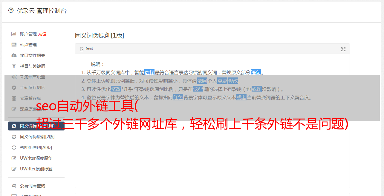 在第一季的教程中,蜘蛛精说过,快照被劫持后,快照将不再更新。可以通过蜘蛛精的自动外链进行更新。这个工具也是一样的。它可以自动发送外部链接,并通过留下痕迹的方式批量生成大量外部链接。拥有3000多个外链URL库,轻松刷上千个外链不是问题。