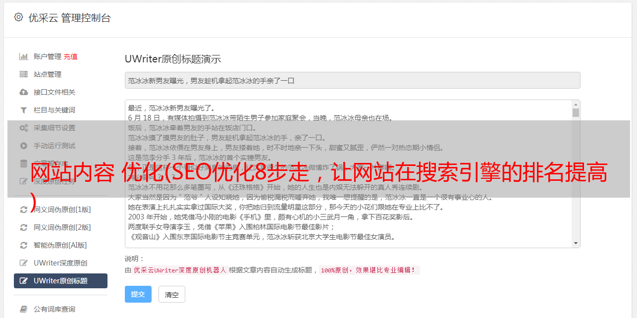 优采云 发布时间: 2022-02-03 04:17网站内容 优化(SEO优化8步走,让网站在搜索引擎的排名提高