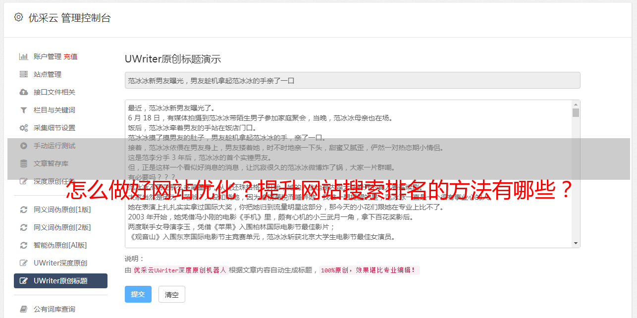 搜索引擎仅喜欢原创内容,并且只要它抓取的内容始终被记住即可。因此,如果要提高网站的搜索排名,可以在工作网络上增加原创的内容以吸引求职者和搜索引擎爬网,但您不应盲目追求原创而忽略其质量内容。如果材料不错,也可以使用伪原创,但是原创的程度必须超过80%。