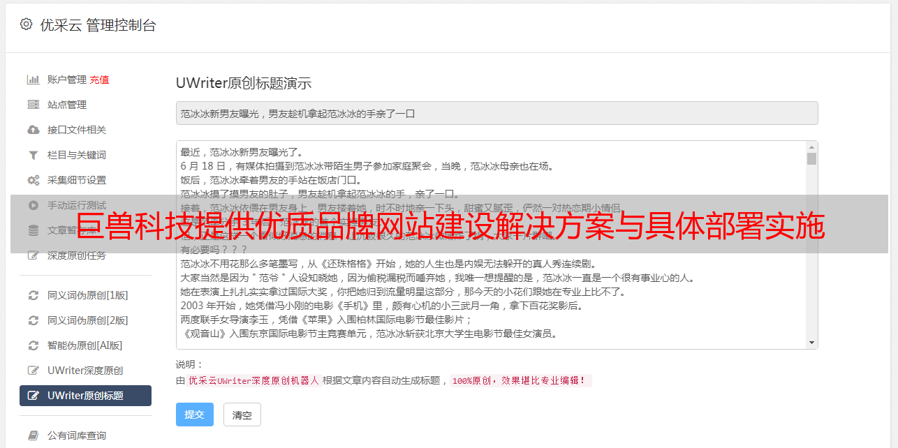 优采云 发布时间: 2021-04-30 22:06巨兽科技提供优质品牌网站建设解决方案与具体部署实施