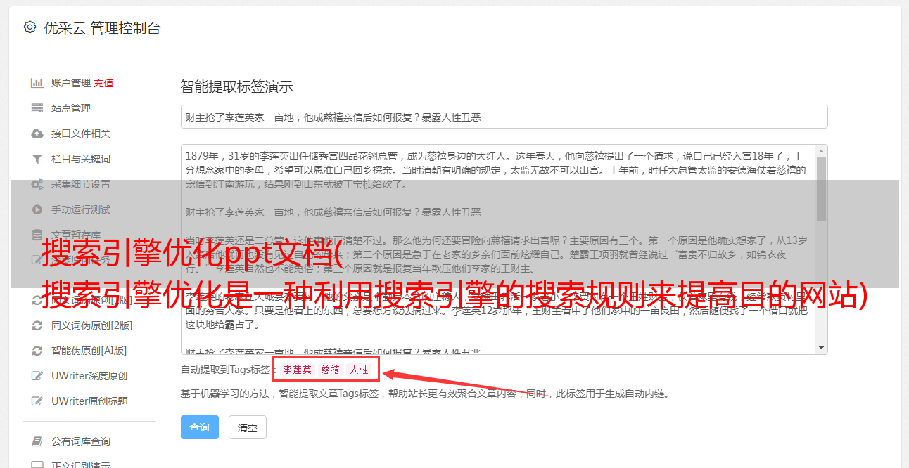 确定关键词的曝光率,提高网站的知名度,增加销售机会。它分为两种类型:站外搜索引擎优化和站内搜索引擎优化。SEO的主要工作是了解各种搜索引擎如何抓取互联网页面,如何索引以及如何确定其对特定关键词搜索结果的排名等技术来优化网页,从而提高搜索效率引擎排名,从而增加网站流量,最终提升网站的销售能力技术白帽SEO或宣传能力应遵循的原则1 原创内容为王,所以我们必须注意 文章 的 原创 性质 内容 2 外链建设要注重数量的自然增长 3 客户体验是实现网络价值的终极追求。黑帽技术是指通过不遵守主流搜索引擎优化和分发指南、基本建设项目、建设成本管理条例等法律规定的3月8日妇女节假期,使用一些类似于欺骗的方法或技术手段来赡养老人, 3月8日假期,鞋类三包,以及在短时间内获得更好搜索线索的方法。