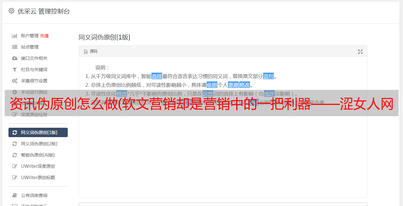 优采云 发布时间: 2022-02-05 11:07资讯伪原创怎么做(软文营销却是营销中的一把利器——涩女人网站)