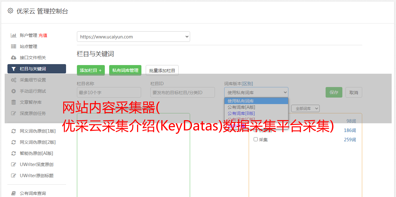 优采云(KeyDatas)数据采集平台是提供网站内容抓取、数据处理和发布,包括各种图片、文字信息等。优采云网页采集器 化繁为简,力求简单化、智能化,让广大站长和需要网页数据的用户更简单快捷地获得想要的数据,可以灵活地进行处理和发布。