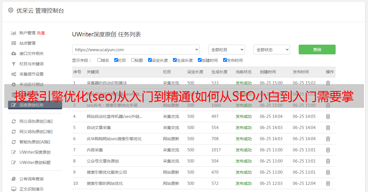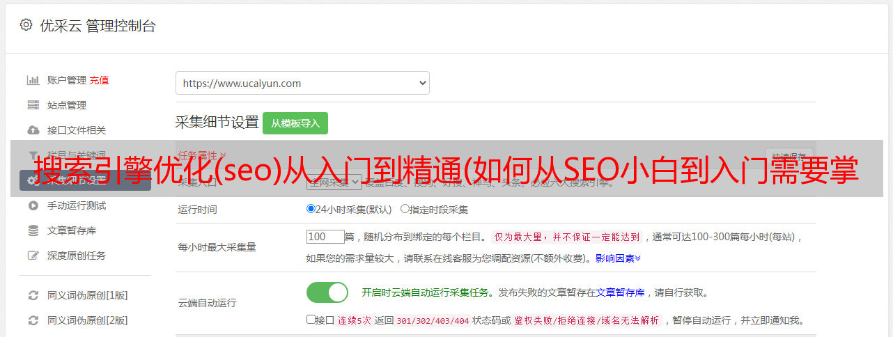 从入门到精通,这个过程需要折腾5个以上网站,这个过程一般需要1-2年,可以找一份全职的SEO工作,来优采云zhixunrui采集