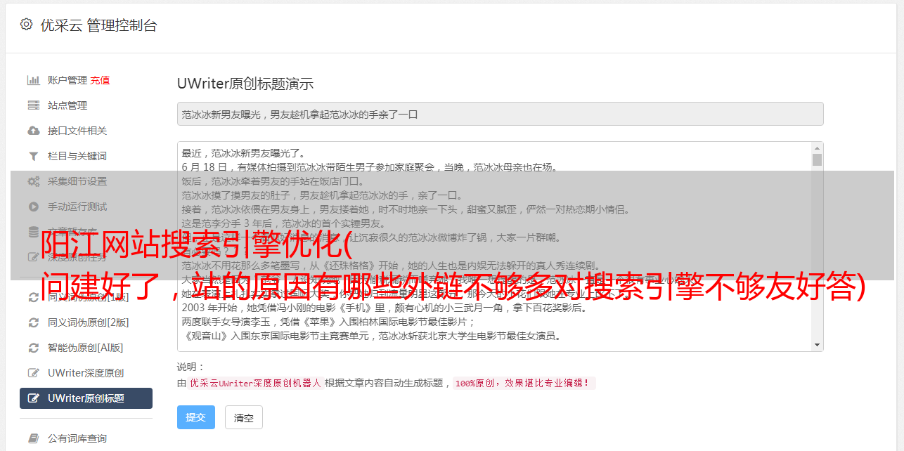 越优质的内容,越会给用户带来好感。相应的,站内的大部分内容都是采集或者,那么就会给人留下是别人留声机的印象,站也上站了。如果能找到,网站的重要性和程度会大打折扣,网站的跳出率会极高,从而带来一系列的负面影响,给网站的运营带来极大的危害。第一站。是的,车站的重要基础。而优质的内容一旦写出来,不仅内容的质量会越来越高,内容对用户的帮助也会越来越大。站内内容也将开始增加,站内内容规模化。编写高质量的内容将不成问题。站,站的度会更高,在Spark计划下,保护会不断加强,对站的未来发展有很大帮助,即使搜索引擎无法达到强大的内容保护效果,但在算法中也会相应得到,然后给内容赋予更高的权重,这是写内容的一个重要好处。