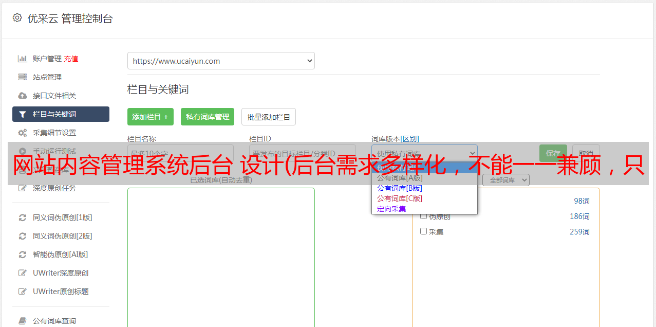 优采云 发布时间: 2022-02-09 15:21网站内容管理系统后台 设计(后台需求多样化,不能一一兼顾,只能蜻蜓点水,尽量深入浅出