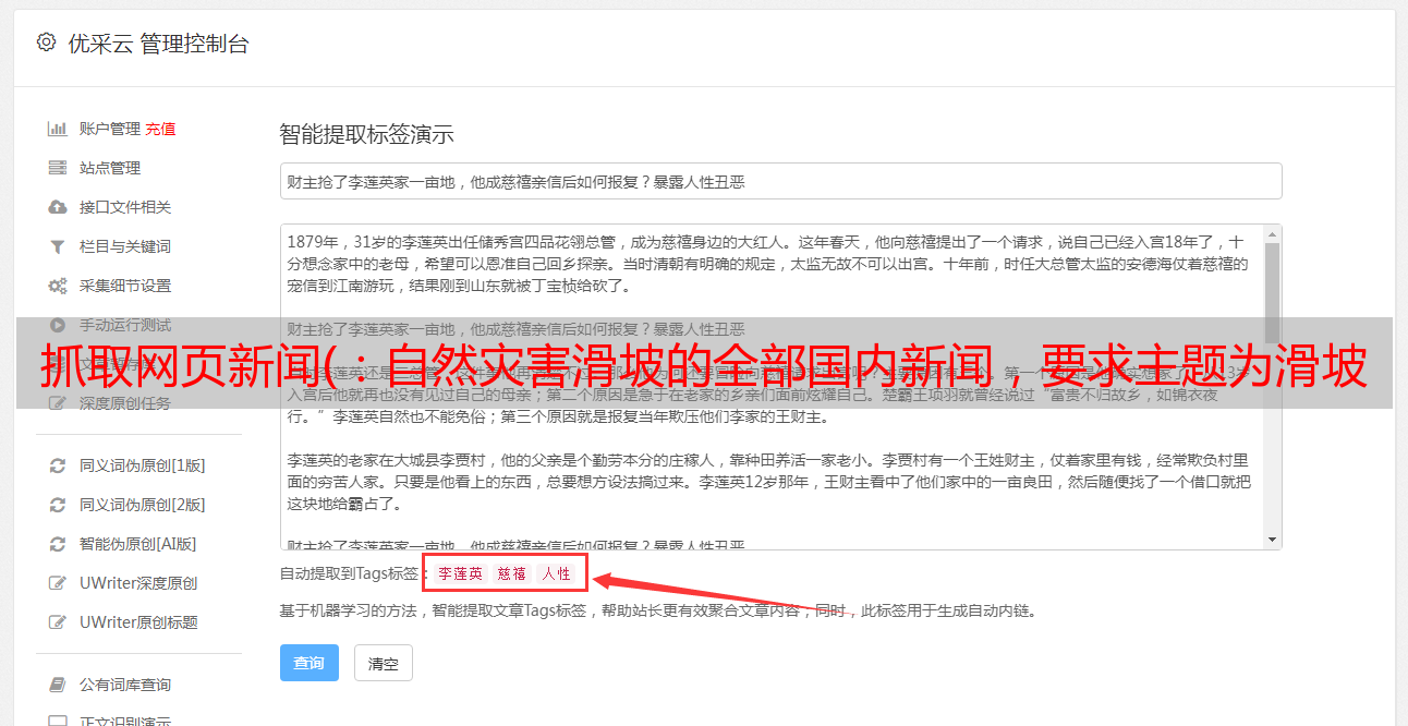 优采云 发布时间: 2022-02-10 01:07抓取网页新闻(:自然灾害滑坡的全部国内新闻,要求主题为滑坡类新闻)