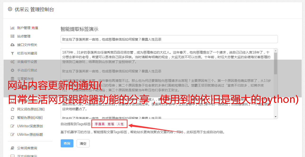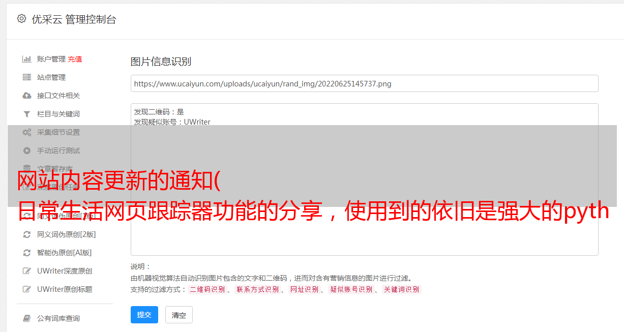 简述解决方案:1、获取网站页面的源码,提取第一个文章的标题,存入电脑;2、设置每个固定时间(比如1小时),提取网站第一个文章的标题。如果与之前存储的标题不一致,则表示有更新。3、发邮件到qq邮箱通知网站有更新要查。同时将最新的文章保存到电脑中,以便下次对比。