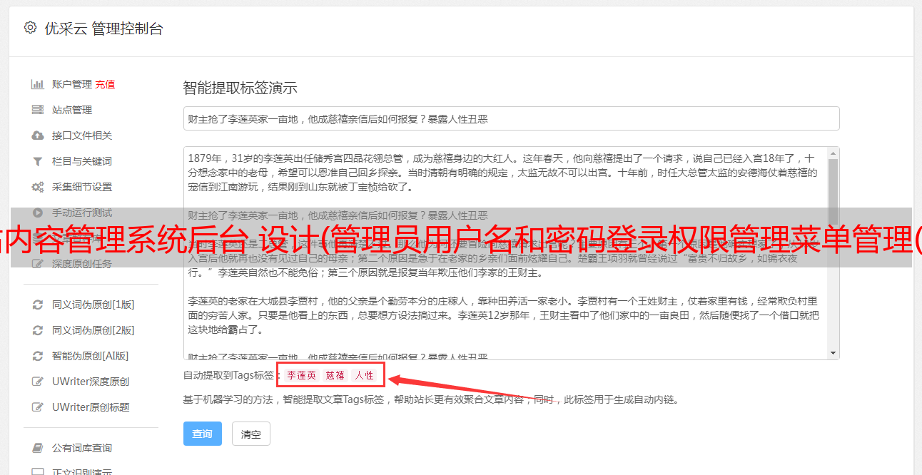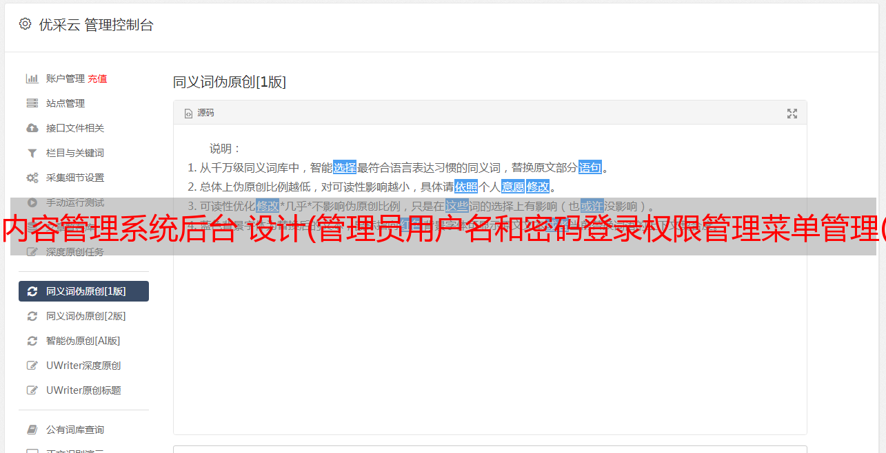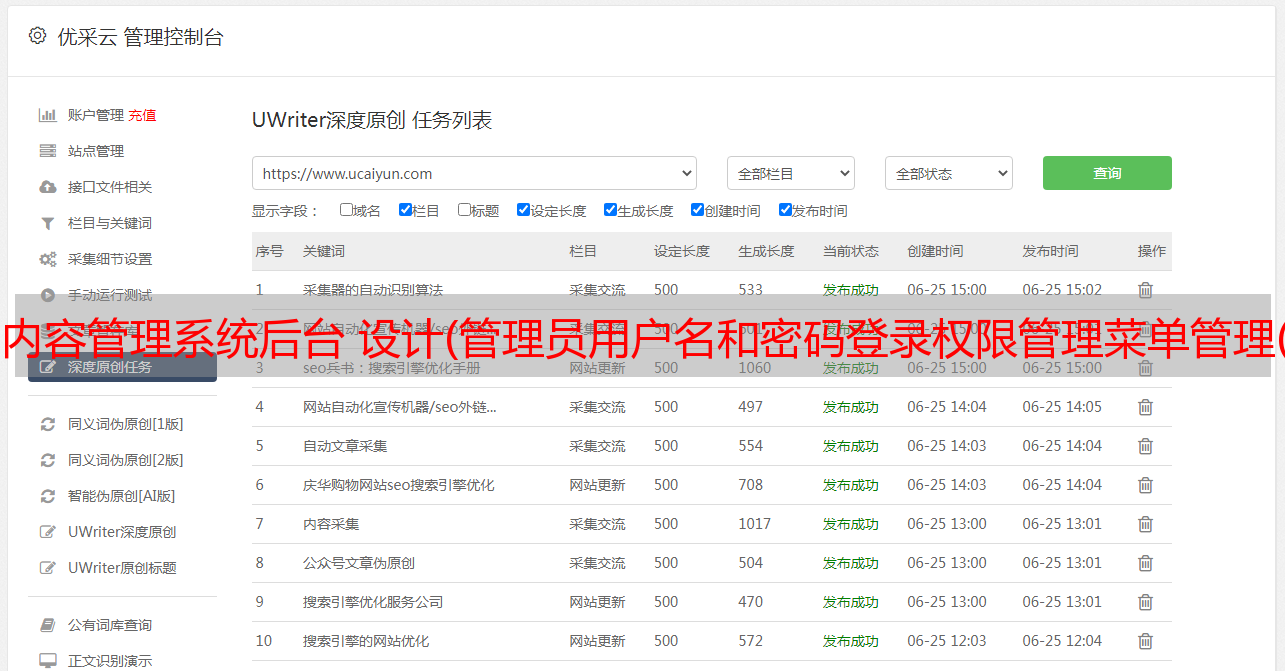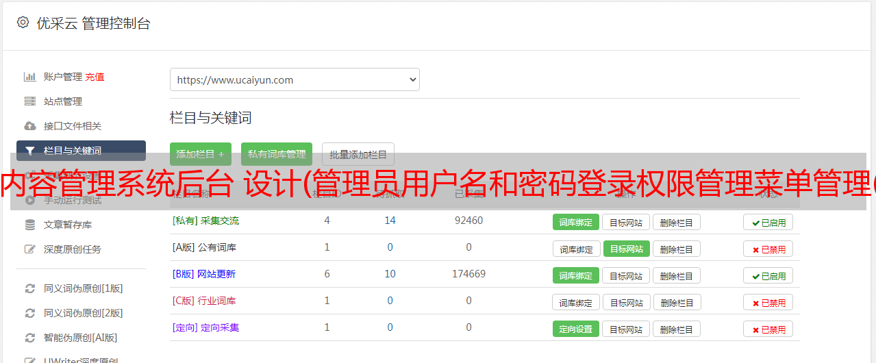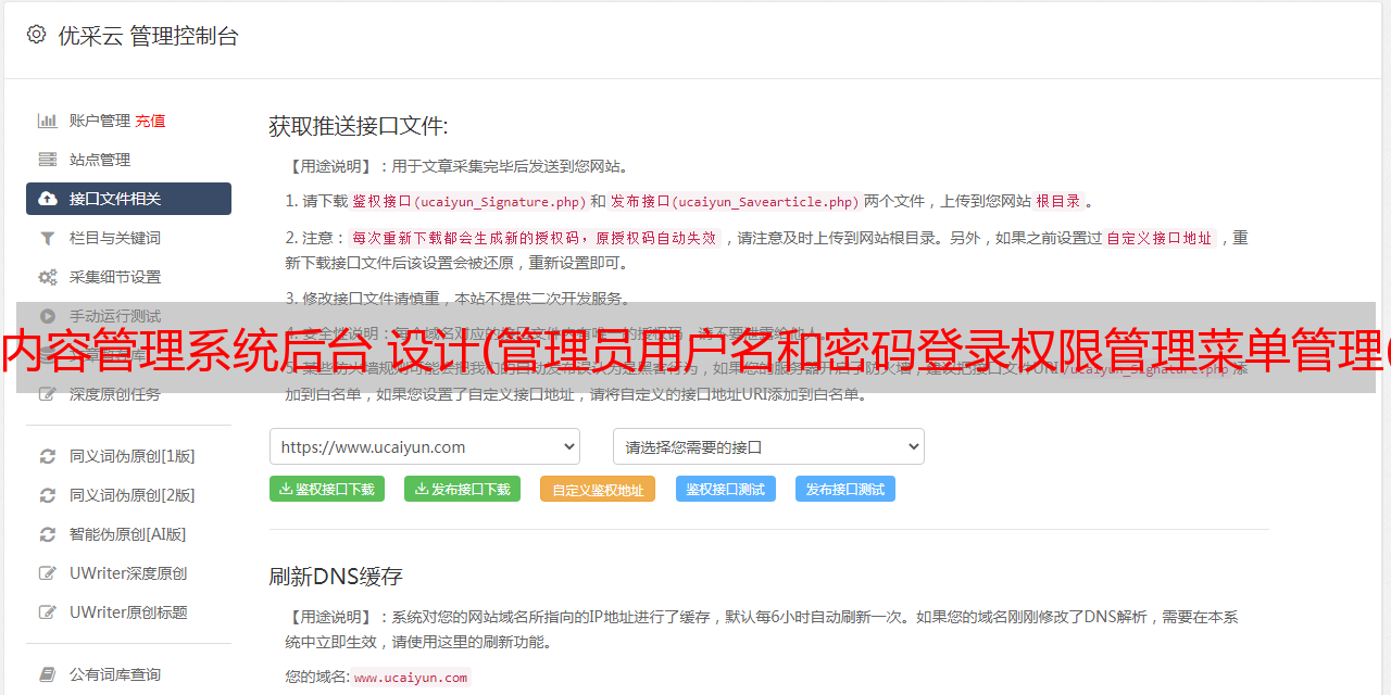 优采云 发布时间: 2022-02-12 22:17网站内容管理系统后台 设计(管理员用户名和密码登录权限管理菜单管理(1级)