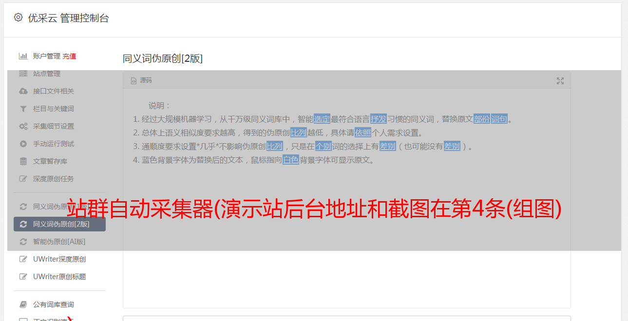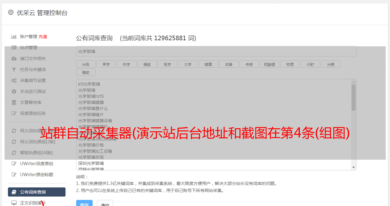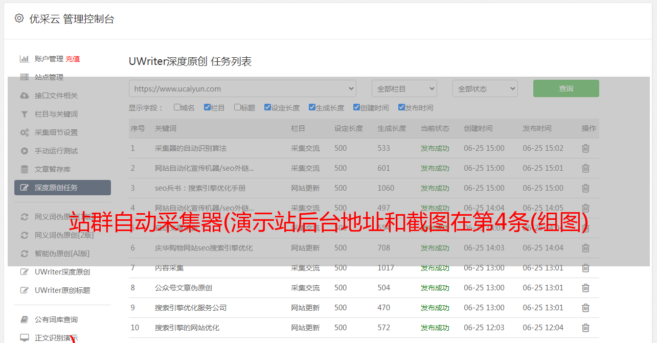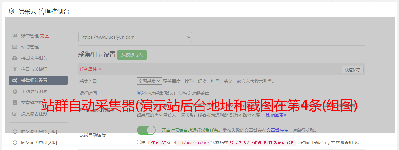 优采云 发布时间: 2022-02-13 01:18站群自动采集器(演示站后台地址和截图在第4条(组图)